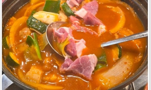 A. 고추장 육수에 돼지고기와 야채를 넣고 끓입니다. 신선한 재료로 만들어져 깊은 맛을 냅니다.