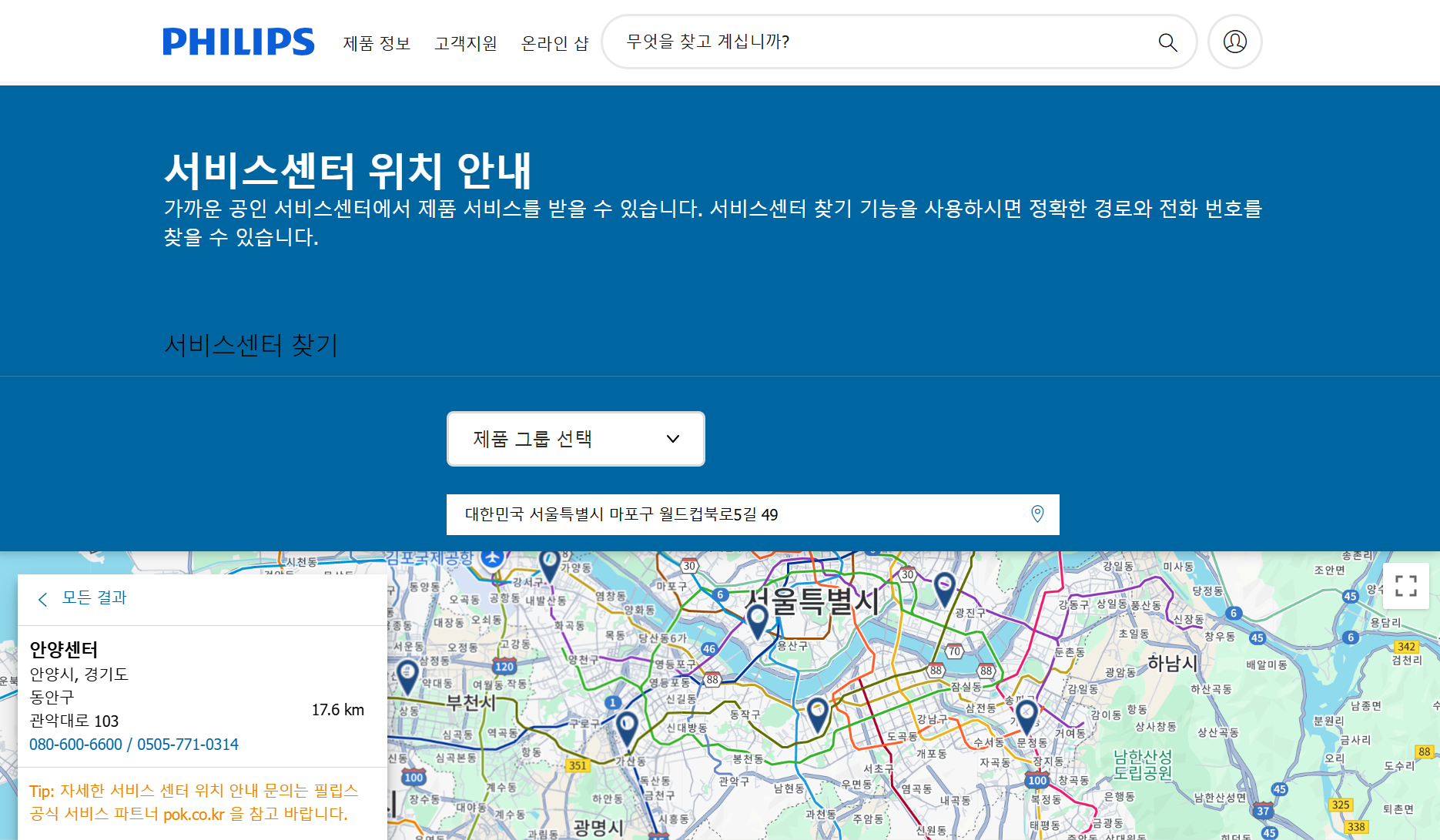 어느 서비스센터로 연락해야 할지 모르겠다면 필립스 고객센터로 먼저 문의하는 것이 가장 빠릅니다.
