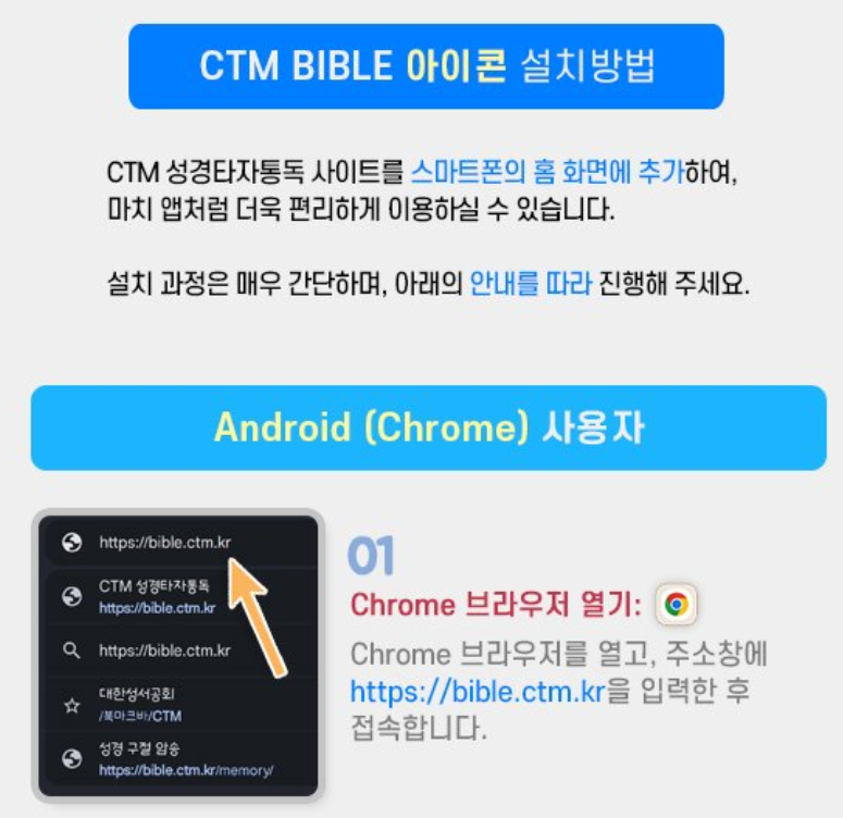 | 안드로이드 | 구글 플레이스토어에서 ‘CTM 성경타자통독’ 검색 |